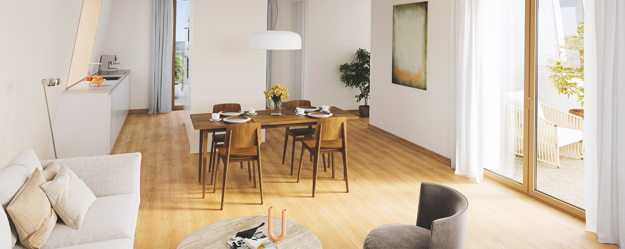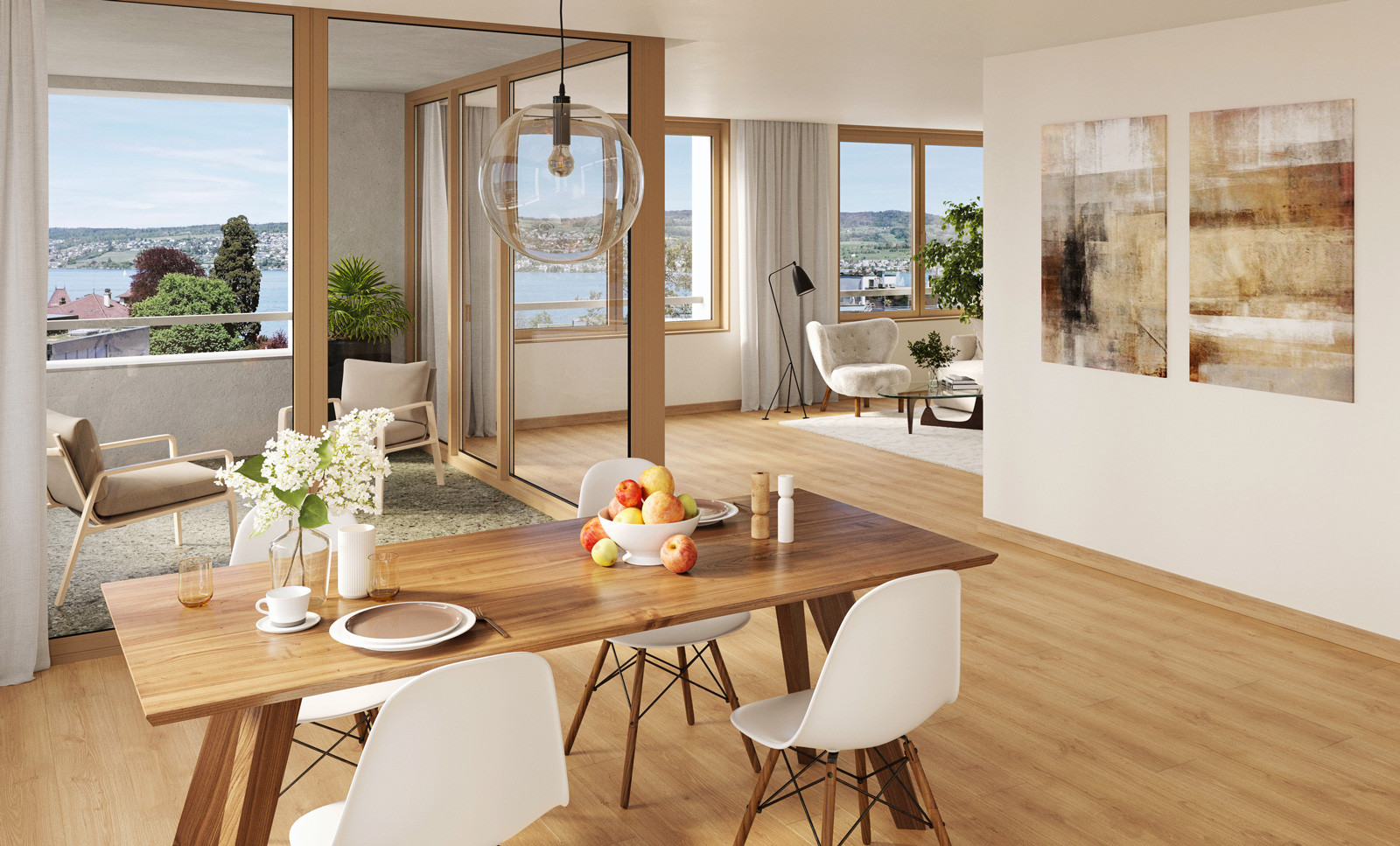 Die Wohn- und Schlafräume werden mit einem hellen Parkett und die Nasszellen und Küchenböden mit Steinplatten belegt. Die Küchen präsentieren sich in hellen Farbtönen und bieten viel Ablage- und Aufbewahrungsflächen. Die Raumkonzepte werden für jede Wohnung individuell entwickelt und zeichnen sich durch grosse Fensterfronten aus. Grosszügige Loggien in den Etagenwohnungen betten sich in den Wohnbereich ein und verleihen ein offenes Wohngefühl. Grossflächige Gartensitzplätze in den Erdgeschosswohnungen sowie Terrassen mit Weitsicht und teils Seesicht in den Attikawohnungen erweitern den Wohnraum. Jede Wohnung bietet ein einzigartiges und individuelles Wohnerlebnis. Weitere Details und die traumhafte Natur belassene Umgebung werden Sie begeistern.